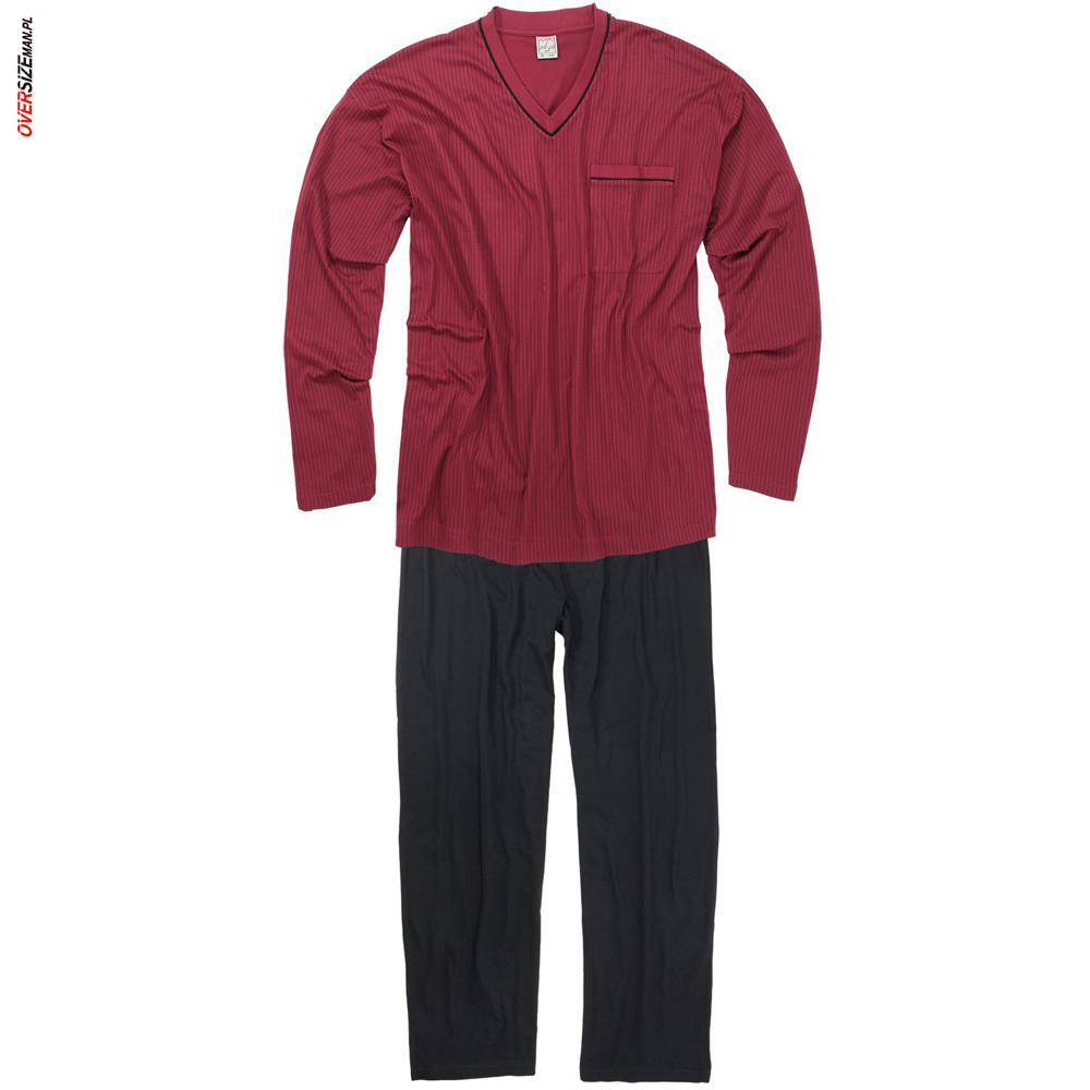 Koszulka posiada długi rękaw, klasyczny kołnierzyk w serek oraz praktyczną kieszonkę z przodu. Długie, proste spodnie wyposażono w lekką gumę w pasie, co zapewnia optymalne dopasowanie do sylwetki i komfort noszenia. Bordowy kolor w czarne paski nadaje pidżamie eleganckiego, a zarazem nowoczesnego charakteru. Szukając innych praktycznych modeli w dużych rozmiarach, warto odwiedzić sklep z dużą odzieżą męską.