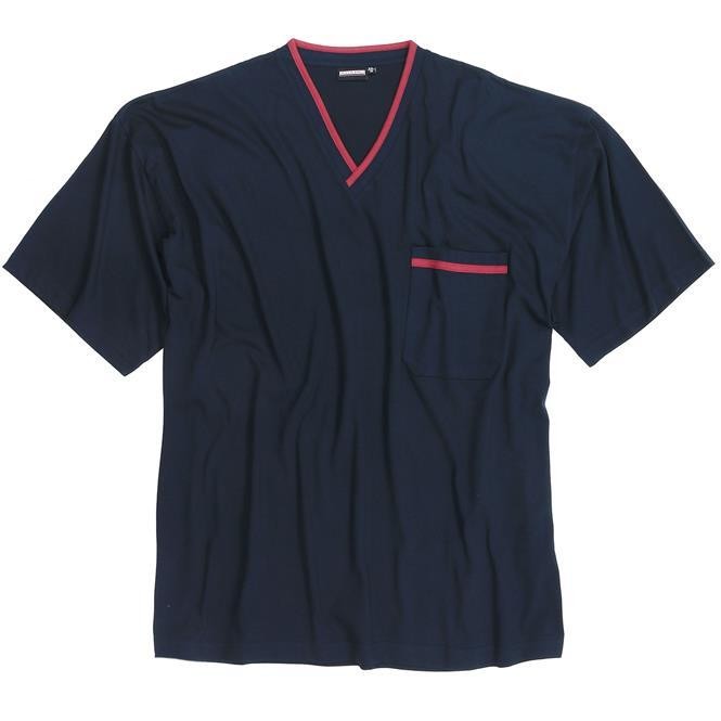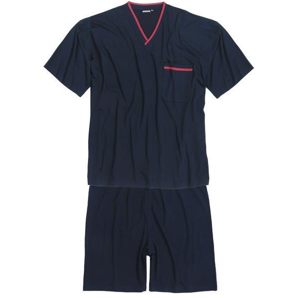 Wysokiej jakości piżama męska niemieckiej marki Adamo to idealny wybór dla mężczyzn poszukujących wygodnej i modnej odzieży w dużych rozmiarach. Zestaw składa się z T-shirtu z krótkim rękawem o wycięciu w szpic oraz krótkich spodenek w tym samym odcieniu, tworząc spójny i komfortowy komplet do snu i wypoczynku.
