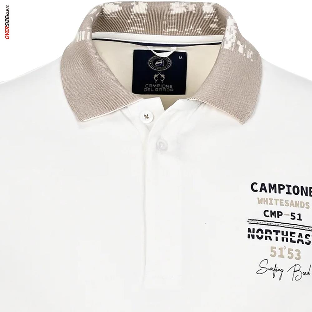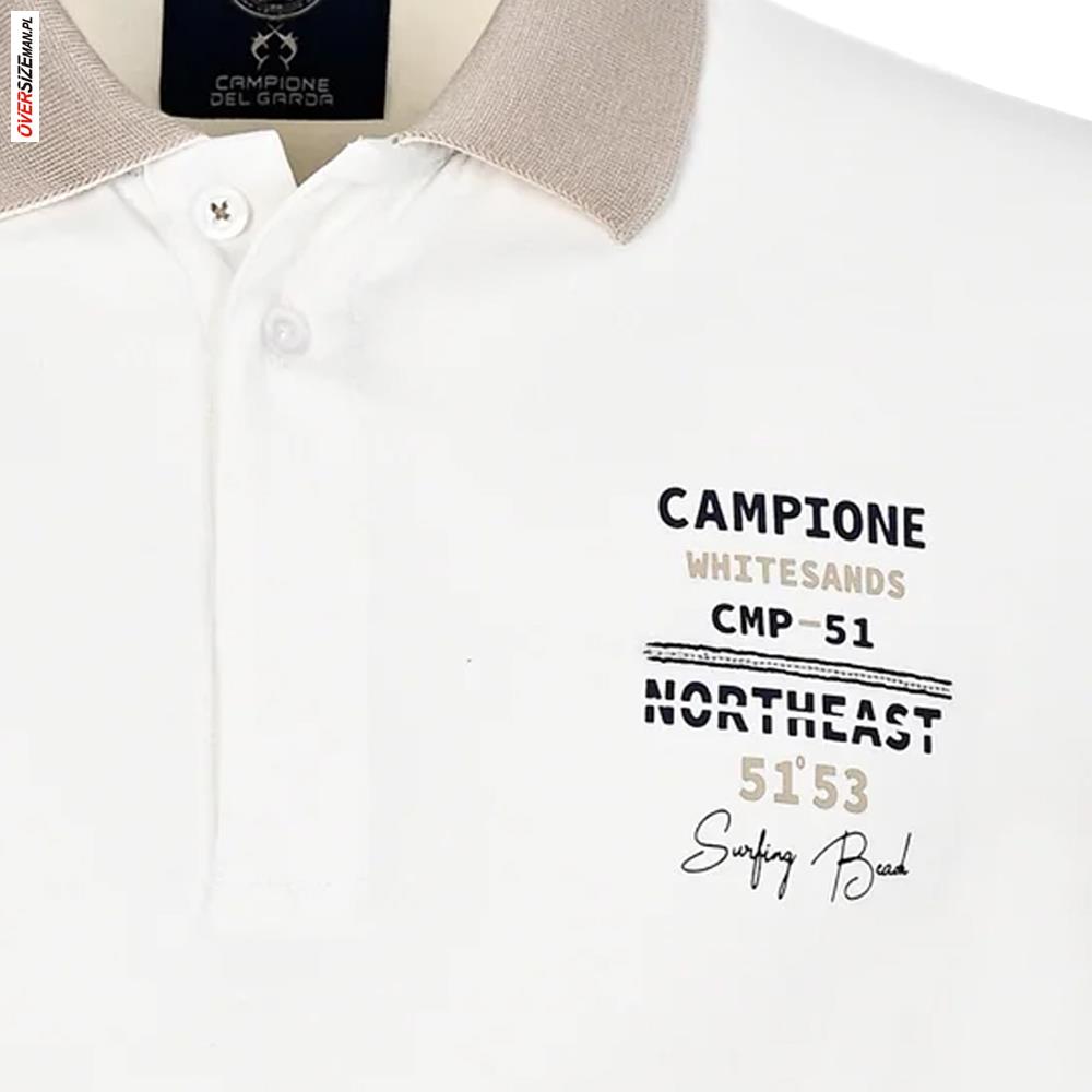 Kremowe polo męskie Campione z kontrastowym, beżowym kołnierzykiem to elegancka i wygodna propozycja dla panów noszących większe rozmiary, którzy szukają stylowej odzieży męskiej w dużych rozmiarach na co dzień. Wykonane z wysokiej jakości bawełny z dodatkiem elastanu, zapewnia komfort noszenia, elastyczność i swobodę ruchów przez cały dzień, a klasyczny, lekko luźny krój dobrze układa się na większej sylwetce bez uczucia ucisku.